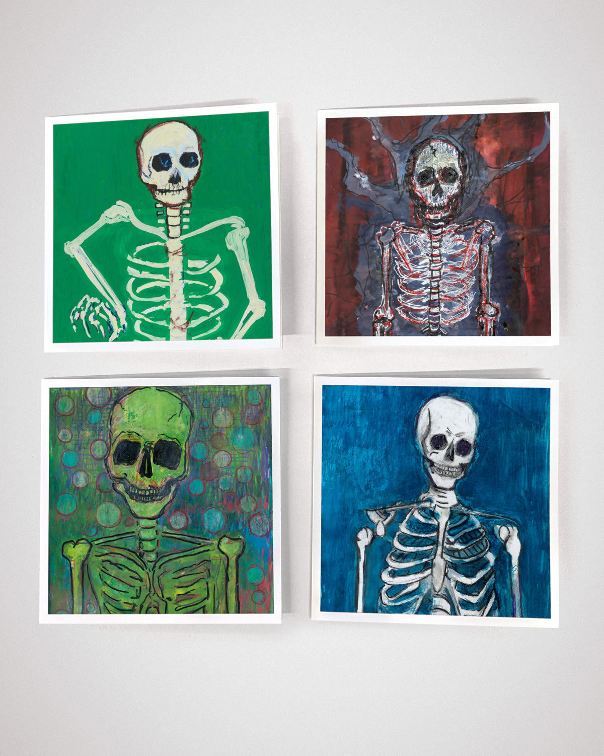 このグリーティングカードセットからは、病的な好奇心、ダークユーモア、そして魂の探求が、青、赤、緑などの鮮やかな色彩と共に溢れ出ています。例えば『Death by Confetti』のような非現実的なシュルレアリスティックなポートレートには、強烈なネオン、コバルト、ブラックが縦横無尽に駆け巡り、「有名人とは何か、公の目に晒されて注目されて生きるとはどういうことか」をユーモラスに、それでいて鋭く捉えられています。ジョニーらしく、これらの感情をコメディアン的な視点で捉え、骨や脊椎をネオンカラーと対比させることで、ハリウッドの極端な浮き沈みを表現しています。